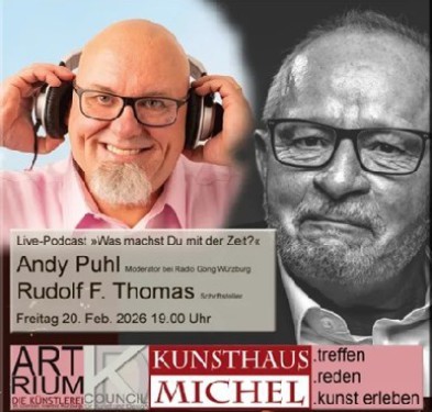 Im Rahmen einer Live-Podcast-Produktion präsentieren Andy Puhl und Rudolf F. Thomas am Freitag, 20. Februar 2025 in Würzburg im Kunsthaus Michel um 19 Uhr den neuen Roman »Anno 2047 - Besuch beim Zeitminister«.
